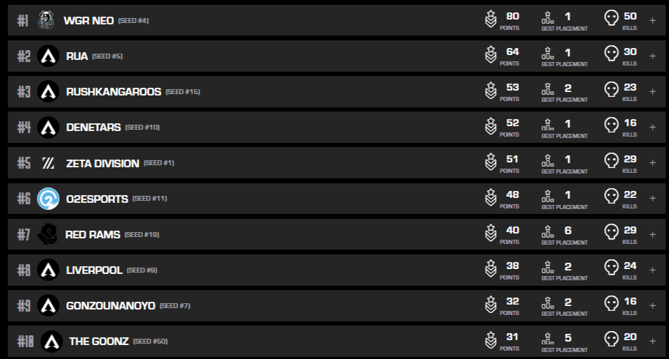 ZETA DIVISION」が2位以下を離しての1位、「RUA」と「Dreadnoughtus」が安定感と上位チームの決勝1位抜けによりプロリーグを確定。